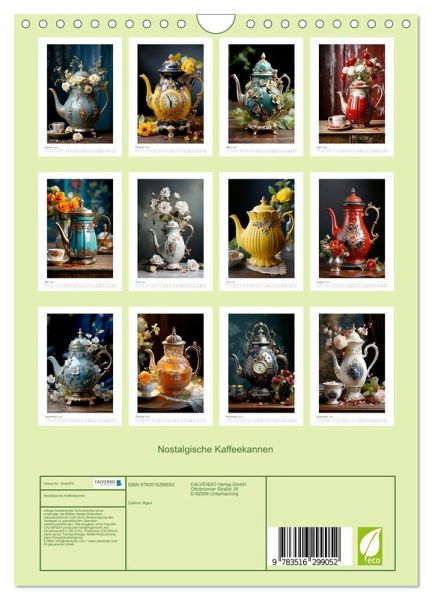 QUALITÄT - Hochwertiger Fotokalender mit 12 wunderschönen Motiven auf lichtbeständigem Bilderdruckpapier, robuste Spiralbindung mit Aufhängebügel.NACHHALTIG - deutliche Abfallreduzierung durch bedarfsgerechte Einzelstückfertigung, umweltfreundliches FSC-zertifiziertes Papier, Produktion in Deutschland, klimabewusste Logistik.PERFEKTES GESCHENK - Kalender für Freunde und Familie, für Kinder und Erwachsene, jung und alt, zu Weihnachten, Geburtstag oder zwischendurch.VIELFALT - Bildkalender in verschiedenen Formaten, z.B. DIN A5, DIN A4, DIN A3 sowie DIN A2. Ob Naturmotiv, Gemälde oder Fotos, ideal für ein persönliches Wohlfühlambiente.Stilvolle Fotos nostalgischer Kaffeekannen - KI generiert von Autor(in): Catill