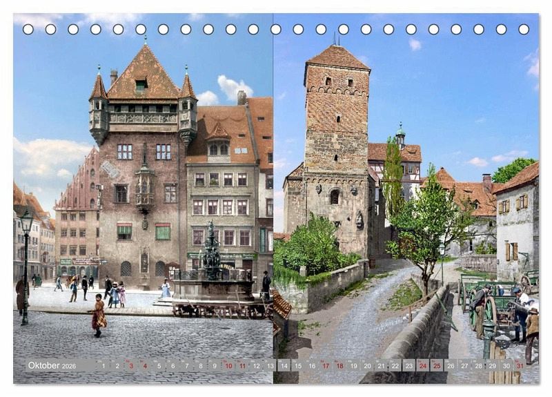 Die schöne Stadt Nürnberg hat eine interessante Geschichte und war früher schon eines der bedeutendsten kulturellen Zentren der Renaissance nördlich der Alpen sowie des Humanismus und der Reformation. Geprägt ist das Stadtbild von mittelalterlicher Architektur wie den Festungsmauern und Türmen der Altstadt mit Blick auf die prächtige Kaiserburg, und war auch in den Jahren 1890 bis 1915 bunt und voller Leben. Diese schönen, farblich restaurierten und nachkolorierten Fotografien sollen einen besonderen Einblick in den Alltag der Menschen und bekannte Orte zur Kaiserzeit geben, auch wenn es in diesem Kalender nur eine kleine Auswahl an Örtlichkeiten ist. Aber nie war diese alte Zeit so lebendig. Eine Zeitreise in Bildern.