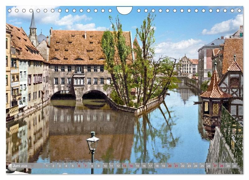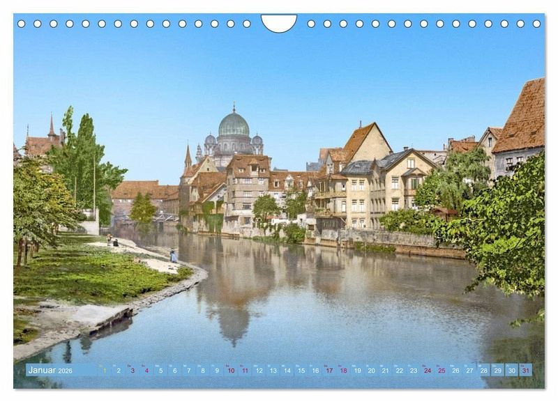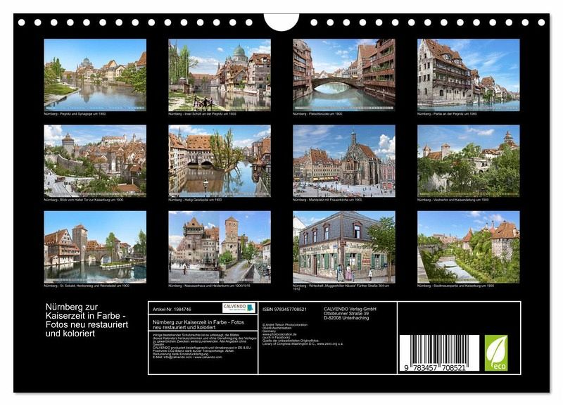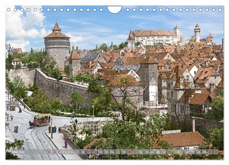 Die schöne Stadt Nürnberg hat eine interessante Geschichte und war früher schon eines der bedeutendsten kulturellen Zentren der Renaissance nördlich der Alpen sowie des Humanismus und der Reformation. Geprägt ist das Stadtbild von mittelalterlicher Architektur wie den Festungsmauern und Türmen der Altstadt mit Blick auf die prächtige Kaiserburg, und war auch in den Jahren 1890 bis 1915 bunt und voller Leben. Diese schönen, farblich restaurierten und nachkolorierten Fotografien sollen einen besonderen Einblick in den Alltag der Menschen und bekannte Orte zur Kaiserzeit geben, auch wenn es in diesem Kalender nur eine kleine Auswahl an Örtlichkeiten ist. Aber nie war diese alte Zeit so lebendig. Eine Zeitreise in Bildern.