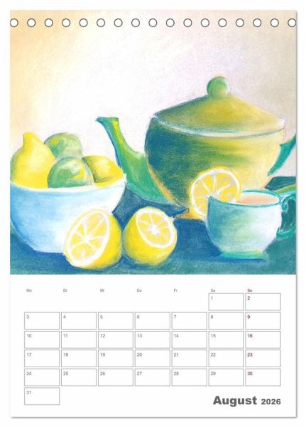 August: Teekanne, Zitronen und Tasse mit Pastellkreide