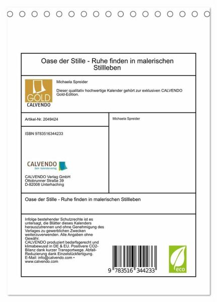 QUALITÄT - Hochwertiger Fotokalender mit 12 wunderschönen Motiven auf lichtbeständigem Bilderdruckpapier, robuste Spiralbindung.NACHHALTIG - deutliche Abfallreduzierung durch bedarfsgerechte Einzelstückfertigung, umweltfreundliches FSC-zertifiziertes Papier, Produktion in Deutschland, klimabewusste Logistik.PERFEKTES GESCHENK - Kalender für Freunde und Familie, für Kinder und Erwachsene, jung und alt, zu Weihnachten, Geburtstag oder zwischendurch.VIELFALT - Bildkalender in verschiedenen Formaten, z.B. DIN A5, DIN A4, DIN A3 sowie DIN A2. Ob Naturmotiv, Gemälde oder Fotos, ideal für ein persönliches Wohlfühlambiente.Gemalte Stillleben - CALVENDO Gold-Edition von Autor(in): Michaela Spreider