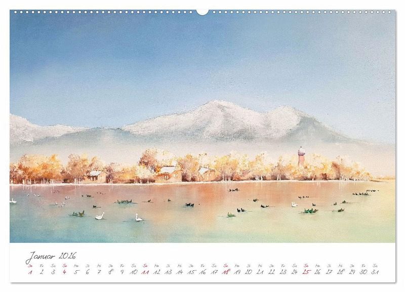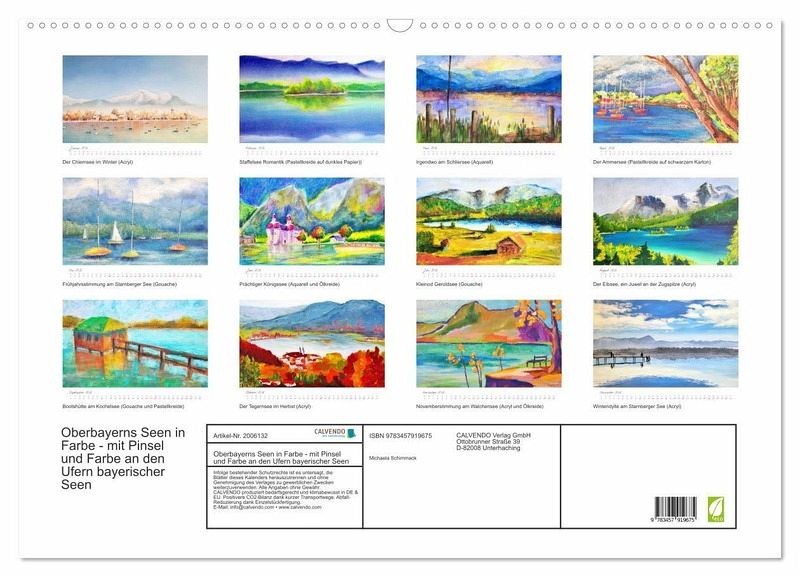 Im schönen Oberbayern liegen zahlreiche Seen, Perlen der Natur, welche vor meist atemberaubenden Bergpanoramen glitzern. Sie begeistern nicht nur Touristen, sondern auch den Künstler, der den Zauber in der Malerei für die Ewigkeit einfängt. Der Kalender stellt einige der beliebtesten Seen im Jahresverlauf vor. Die Bilder wurden, der Jahreszeit und dem Motiv entsprechend, in unterschiedlichen Techniken gemalt, wie beispielsweise Acryl, Pastellkreide oder Gouache.