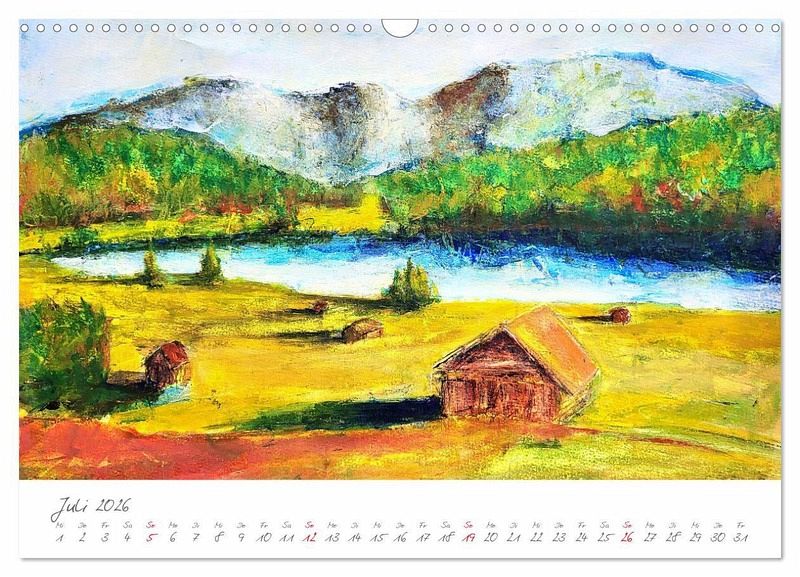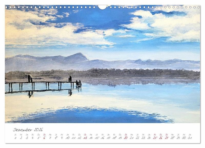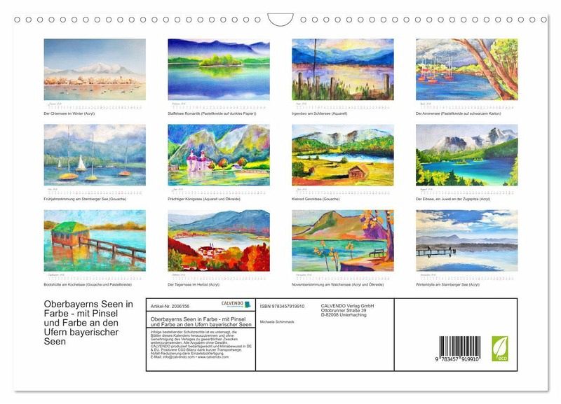 Im schönen Oberbayern liegen zahlreiche Seen, Perlen der Natur, welche vor meist atemberaubenden Bergpanoramen glitzern. Sie begeistern nicht nur Touristen, sondern auch den Künstler, der den Zauber in der Malerei für die Ewigkeit einfängt. Der Kalender stellt einige der beliebtesten Seen im Jahresverlauf vor. Die Bilder wurden, der Jahreszeit und dem Motiv entsprechend, in unterschiedlichen Techniken gemalt, wie beispielsweise Acryl, Pastellkreide oder Gouache.