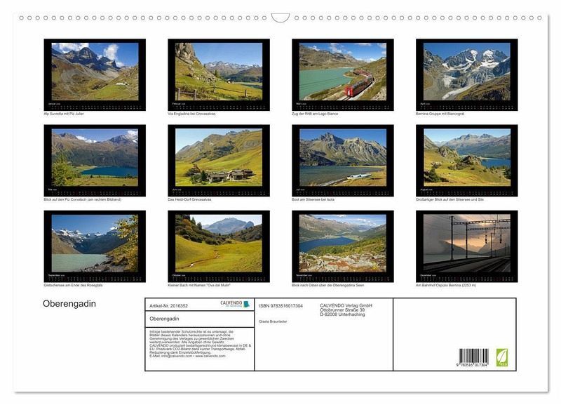 QUALITÄT - Hochwertiger Fotokalender mit 12 wunderschönen Motiven auf lichtbeständigem Bilderdruckpapier, robuste Spiralbindung mit Aufhängebügel.NACHHALTIG - deutliche Abfallreduzierung durch bedarfsgerechte Einzelstückfertigung, umweltfreundliches FSC-zertifiziertes Papier, Produktion in Deutschland, klimabewusste Logistik.PERFEKTES GESCHENK - Kalender für Freunde und Familie, für Kinder und Erwachsene, jung und alt, zu Weihnachten, Geburtstag oder zwischendurch.VIELFALT - Bildkalender in verschiedenen Formaten, z.B. DIN A5, DIN A4, DIN A3 sowie DIN A2. Ob Naturmotiv, Gemälde oder Fotos, ideal für ein persönliches Wohlfühlambiente.Das Oberengadin - eine Traumlandschaft in den Schweizer Alpen von Autor(in): Gisela Braunleder