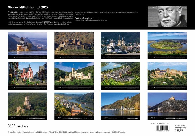 Friedrich Gier, geboren am 8.4.1946. 1967 bis 1971 Studium der Malerei und Freien Grafik an den Kölner Werkschulen. Ab 1971 als Grafiker und Fotograf tätig. Veröffentlichungen in Deutschland, Frankreich und Italien als Fotograf von Bildbänden und Reiseführern, sowie eigenständige Berichte in diversen Zeitschriften, wie GEO Frankreich und Bell' Europa Italien. "Seit vielen Jahren ist der Rhein, besonders das UNESCO-Welterbe Oberes Mittelrheintal, ein Schwerpunkt meiner fotografischen Arbeiten. Die Verbindung von Landschaft und Architektur, von Licht und Farben, macht diese Landschaft zu einem stimmungsvollen Seherlebnis."