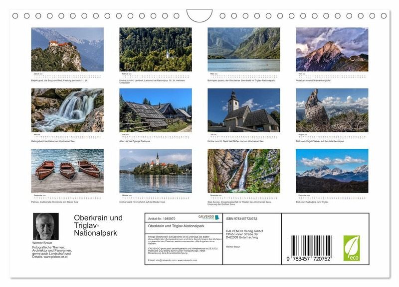 Seen voll kristallklarem Wasser und mächtige Berggipfel - das bietet die Oberkrain, das Land an der Südseite der Ostalpen. Mitten in der Oberkrain liegt auch Sloweniens einziger Nationalpark, benannt nach dem Triglav; mit 2864 Metern der höchste Berg Sloweniens. Der Nationalpark bietet naturnahe Wanderwege, gute Luft und grandiose Fernblicke. Einen Vorgeschmack darauf bringt Ihnen dieser Kalender.