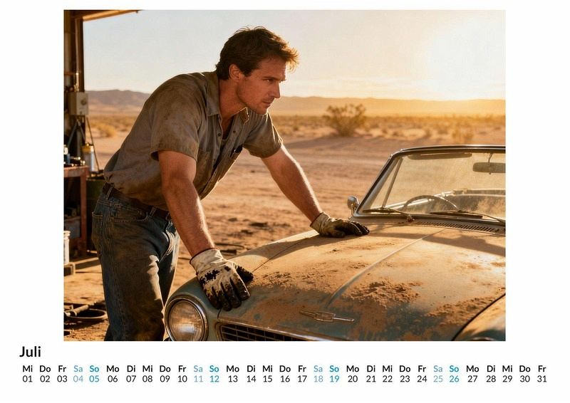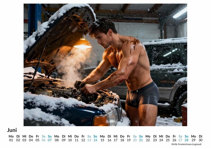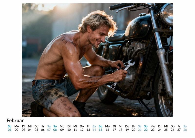 Die Luft in der Werkstatt ist erfüllt vom Geruch nach Motoröl und Metall. Hier trifft rohe Kraft auf präzise Technik, ein Zusammenspiel, das fasziniert. Der Kalender "Ölverschmierte Mechaniker" fängt genau diese Atmosphäre ein und präsentiert zwölf Szenen voller Konzentration und körperlicher Arbeit an leistungsstarken Maschinen. Dieser Kalender ist eine passende Wahl für: * Liebhaber einer rauen und authentischen Werkstattästhetik. * Personen, die ein besonderes Geschenk mit einem Faible für Technik und Muskelkraft suchen. * Alle, die eine unkonventionelle und freizügige Wanddekoration bevorzugen. Jeder Monat enthüllt eine neue Perspektive auf die Arbeit am Motor. Ölglänzende Haut trifft auf kühles Metall, konzentrierte Blicke sind auf die komplexe Mechanik gerichtet. Die tief sitzenden Arbeitshosen geben den Blick frei auf trainierte Oberkörper und betonen die angespannte Haltung der Männer, die sich über offene Motorhauben beugen. Diese Motive wurden durch fortschrittliche digitale Prozesse zum Leben erweckt und zeigen eine idealisierte Darstellung der Szenerie. Die Bilder sind fotografische Kompositionen, keine gemalten Werke, und fangen die Ästhetik des Moments ein. Beim Kauf dieses Kalenders kann man Folgendes erwarten: * Zwölf Monatsblätter mit unterschiedlichen Werkstattszenen. * Ein übersichtliches Kalendarium für die Jahresplanung. * Ein Wandkalender, der Monat für Monat einen neuen Blickfang bietet. Der Kalender "Ölverschmierte Mechaniker" verbindet die Welt der Motoren mit einer freizügigen Darstellung von Kraft und Männlichkeit. Eine Sammlung von Bildern, die das ganze Jahr über begleitet und die rohe Energie der Werkstatt in den Alltag bringt. Es lohnt sich, die einzelnen Monatsmotive zu entdecken und sich von der Komposition aus Mensch und Maschine inspirieren zu lassen.
