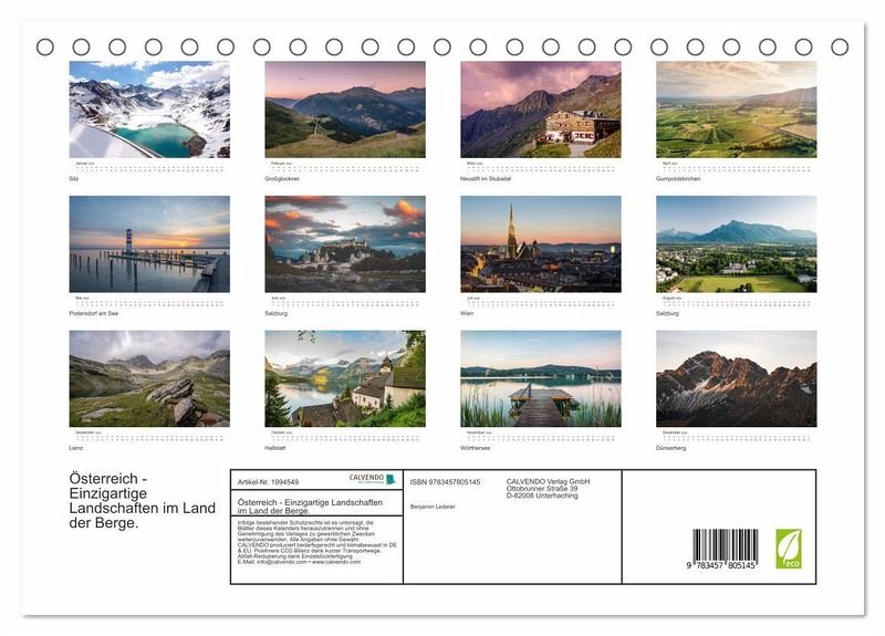 QUALITÄT - Hochwertiger Fotokalender mit 12 wunderschönen Motiven auf lichtbeständigem Bilderdruckpapier, robuste Spiralbindung.NACHHALTIG - deutliche Abfallreduzierung durch bedarfsgerechte Einzelstückfertigung, umweltfreundliches FSC-zertifiziertes Papier, Produktion in Deutschland, klimabewusste Logistik.PERFEKTES GESCHENK - Kalender für Freunde und Familie, für Kinder und Erwachsene, jung und alt, zu Weihnachten, Geburtstag oder zwischendurch.VIELFALT - Bildkalender in verschiedenen Formaten, z.B. DIN A5, DIN A4, DIN A3 sowie DIN A2. Ob Naturmotiv, Gemälde oder Fotos, ideal für ein persönliches Wohlfühlambiente.Wunderbare Bilder aus ganz Österreich. von Autor(in): Benjamin Lederer