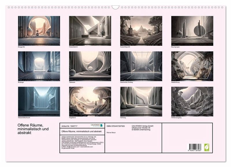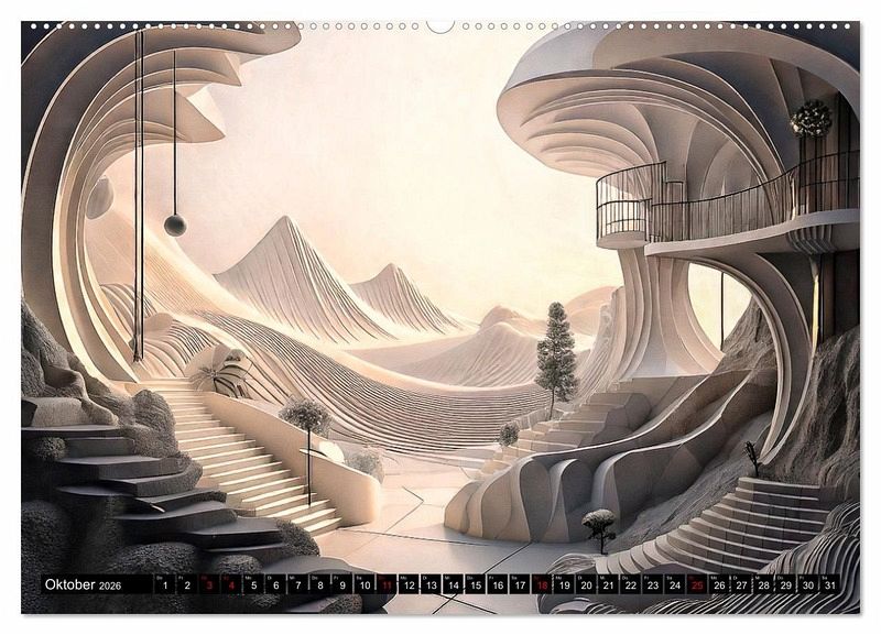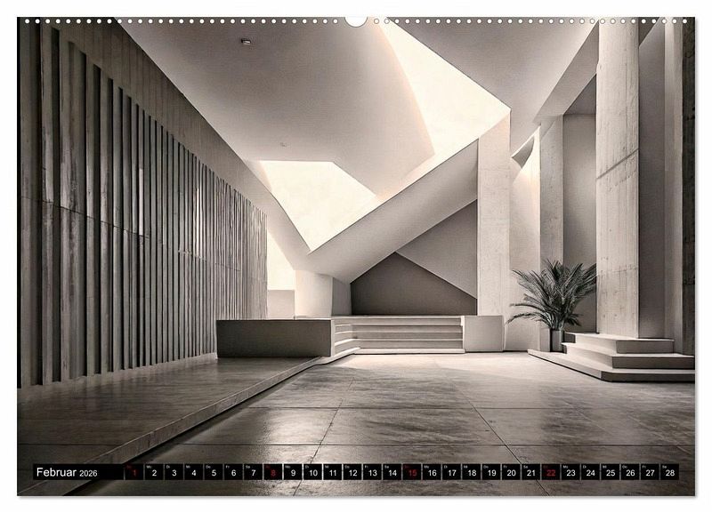 Entdecken wir eine Welt, in der die Schönheit der Natur auf minimalistische Klarheit trifft. Dieser einzigartige Kalender präsentiert 12 bemerkenswerte Bilder von Räumen, die die Grenzen zwischen Realität und Abstraktion verwischen. Jedes Bild ist ein Meisterwerk der Reduktion, in dem vertraute Naturelemente in elegante, glatte Formen verwandelt werden. Horizontale und vertikale Strukturen sind begradigt, um eine harmonische Balance zu schaffen, die das Auge beruhigt und den Geist befreit. Die Verwendung von KI in diesem Projekt ermöglicht es, die Essenz der Landschaft einzufangen und daraus neue faszinierende Formen zu schaffen. Die Bilder laden dazu ein, die Welt mit anderen Augen zu sehen und die Schönheit, aber auch die Kälte der Einfachheit zu entdecken.