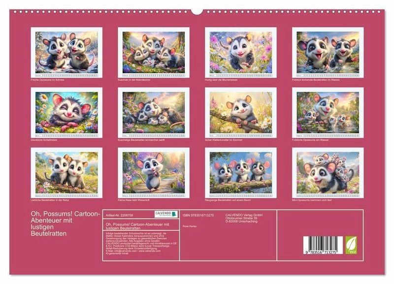 Dieser Kalender vereint Humor, Niedlichkeit und Lebensfreude. Jede Illustration wurde liebevoll mit der Hilfe von KI erstellt und zeigt die kleinen Beutelratten in witzigen und herzerwärmenden Szenen. Ein Kalender der Freude schenkt und sich perfekt als Geschenk für alle eignet, die Cartoons und Opossums lieben.