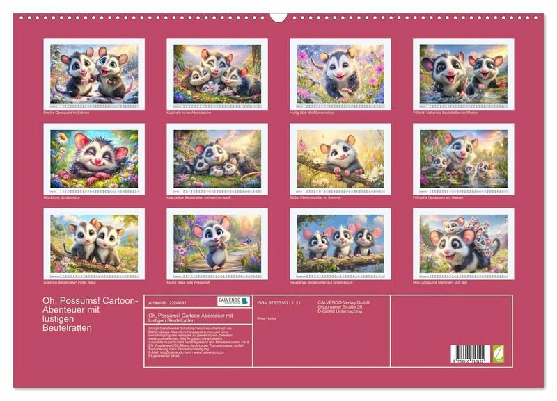 Dieser Kalender vereint Humor, Niedlichkeit und Lebensfreude. Jede Illustration wurde liebevoll mit der Hilfe von KI erstellt und zeigt die kleinen Beutelratten in witzigen und herzerwärmenden Szenen. Ein Kalender der Freude schenkt und sich perfekt als Geschenk für alle eignet, die Cartoons und Opossums lieben.