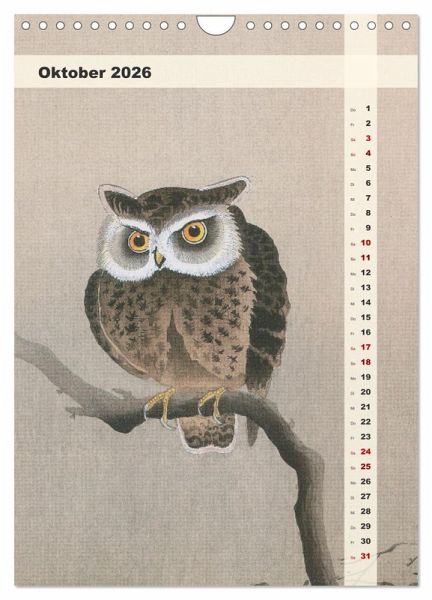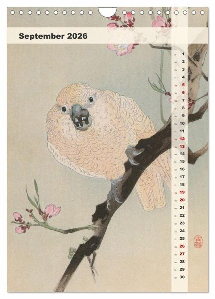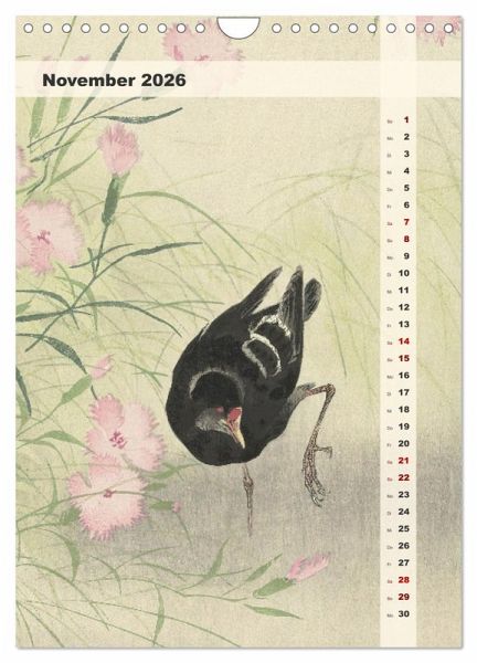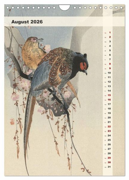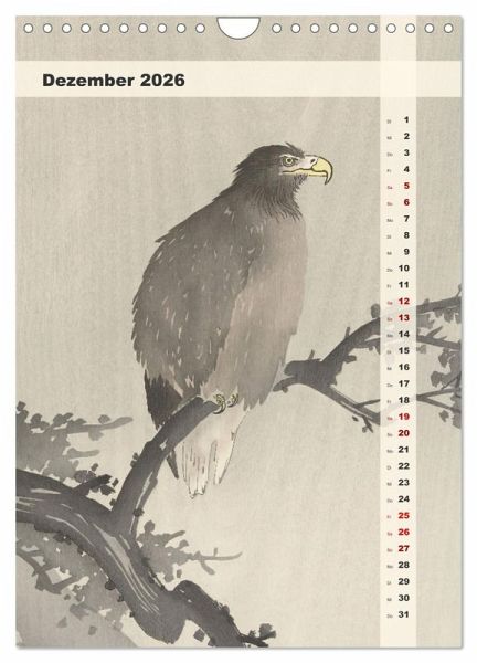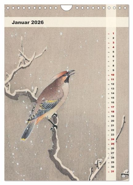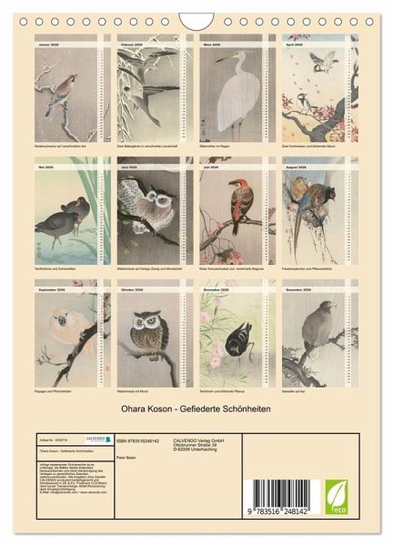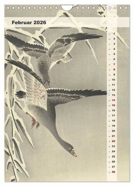 Dieser Kalender entführt Sie in die zauberhafte Welt der Vögel, wie sie nur der japanische Künstler Ohara Koson darstellen konnte. Mit seinen meisterhaften Darstellungen fängt Koson die Eleganz und Anmut der Vogelwelt ein, kombiniert mit der subtilen Schönheit der japanischen Natur. Jeder Monat präsentiert ein neues, kunstvoll gestaltetes Motiv, das die Vielfalt und Pracht der gefiederten Wesen zeigt. Lassen Sie sich von Kosons feinem Gespür für Details und Farben durch das Jahr begleiten und erleben Sie die Magie dieser zeitlosen Kunstwerke. Ein Kalender für Naturliebhaber und Kunstkenner gleichermaßen.