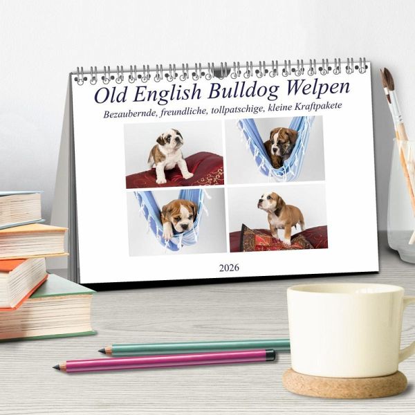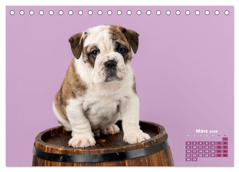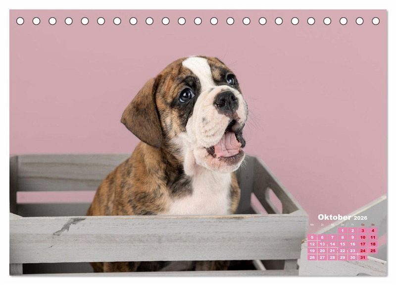 Januar: Old English Bulldog Welpe vor zwei Kisten