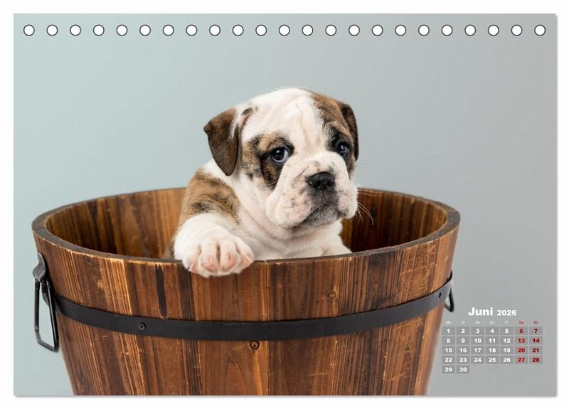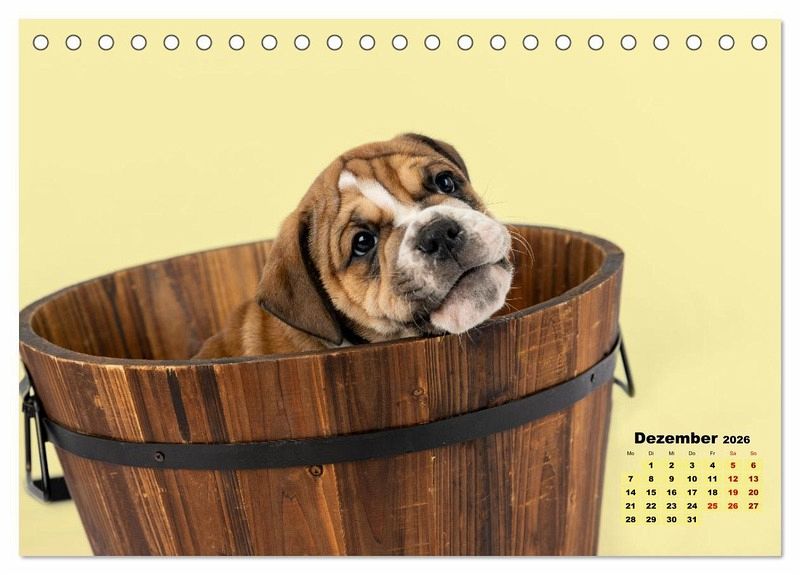 Dezember: Old English Bulldog Welpe schaut aus einem Bottich