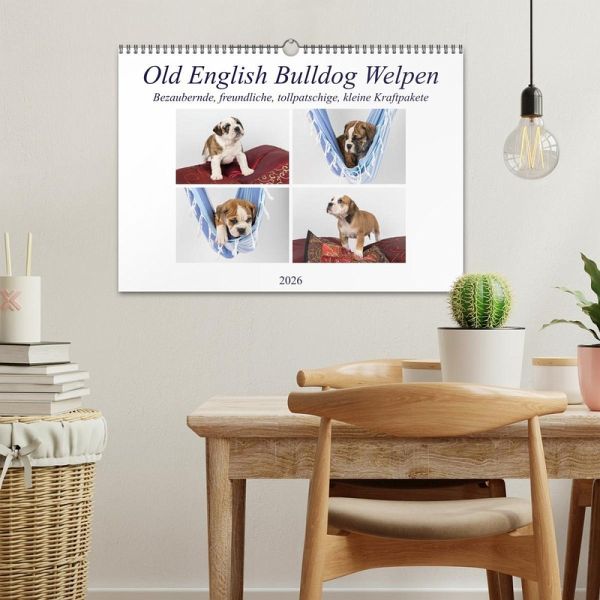 Januar: Old English Bulldog Welpe vor zwei Kisten