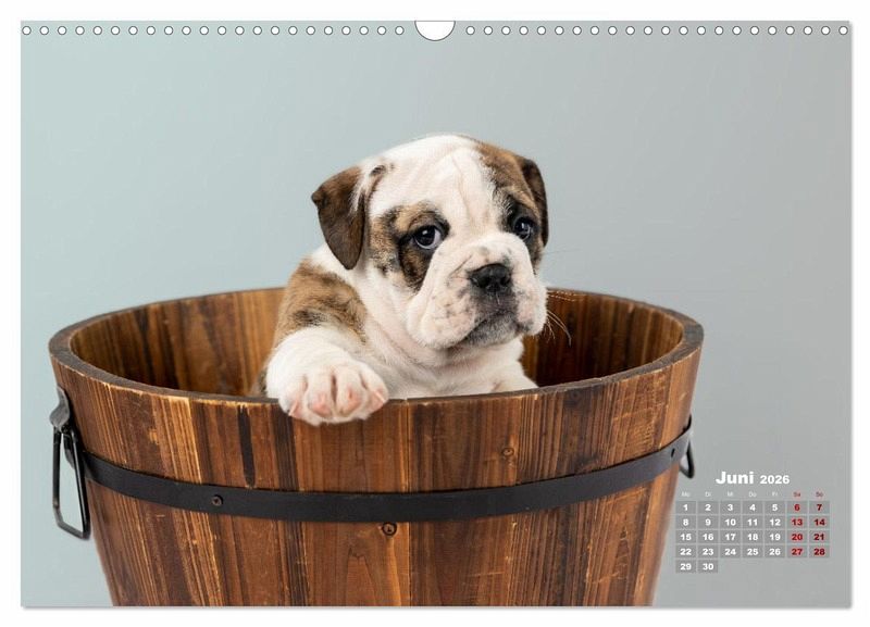 Dezember: Old English Bulldog Welpe schaut aus einem Bottich