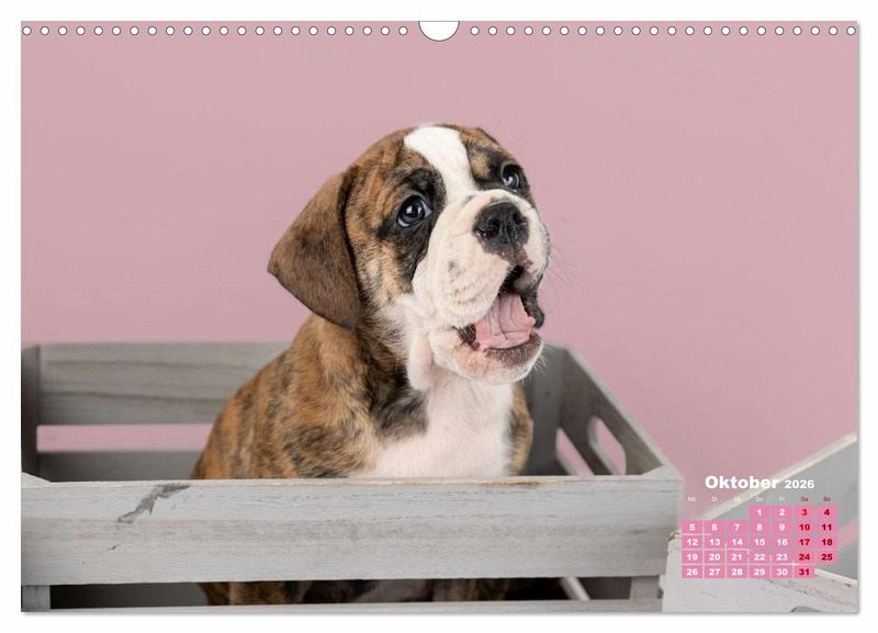 Oktober: Old English Bulldog Welpe sitzt in einer Holzkiste