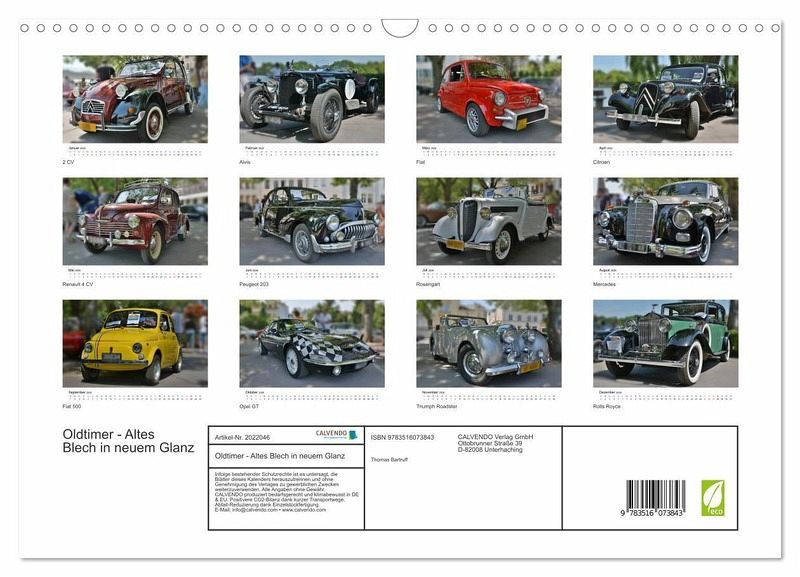 Ein Kalender für Oldtimerfreunde und alle die sich am Anblick edler Karossen erfreuen können. Dieser Kalender zeigt in 12 schönen Fotos eine kleine Auswahl verschiedener Fabrikate.