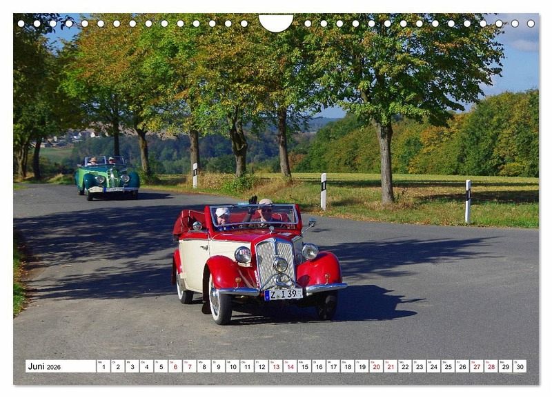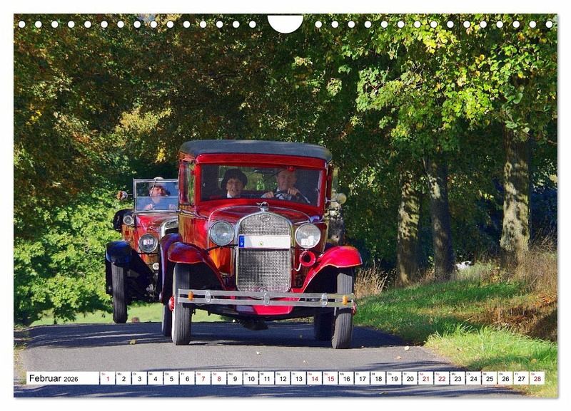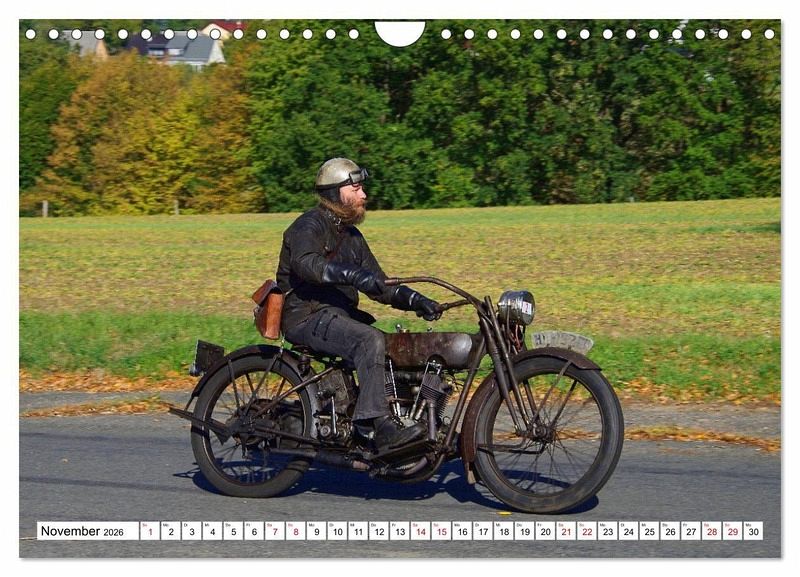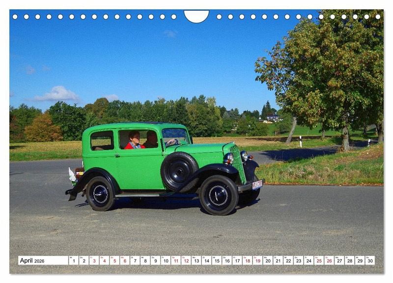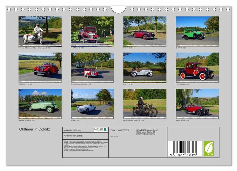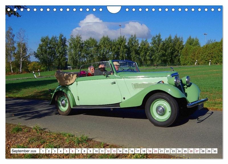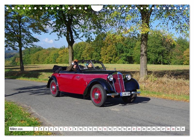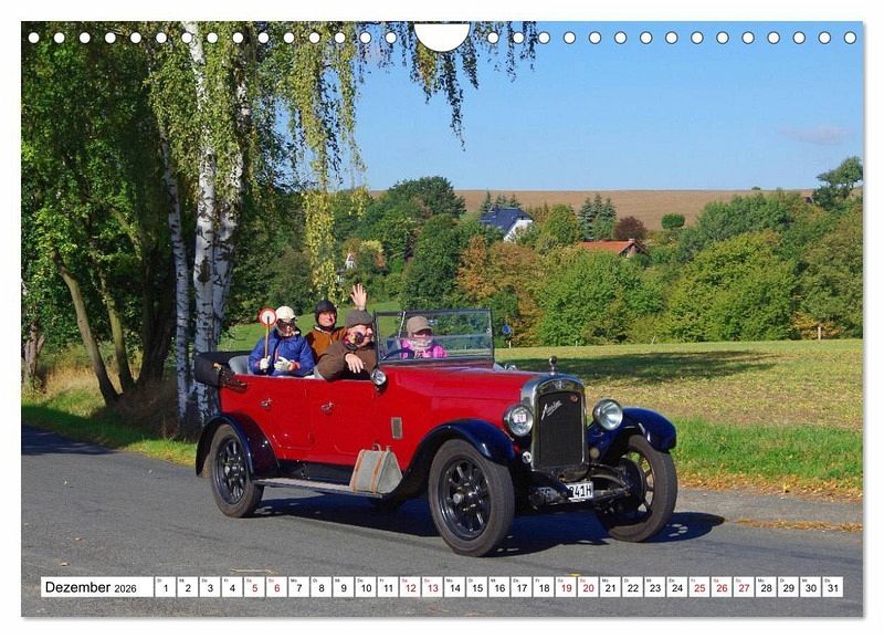 Die Aufnahmen der Kalenderblätter entstanden während der 50. Oldtimerrallye "Rund um den Rochlitzer Berg" bei der Fahrt durch Ortsteile der sächsischen Kleinstadt Colditz. Wunderschöne Herbstfarben und blauer Himmel mit weißen Wolken bilden den Hintergrund für Fahrer und Beifahrer der an der Rallye teilnehmenden Autos und Motorräder.