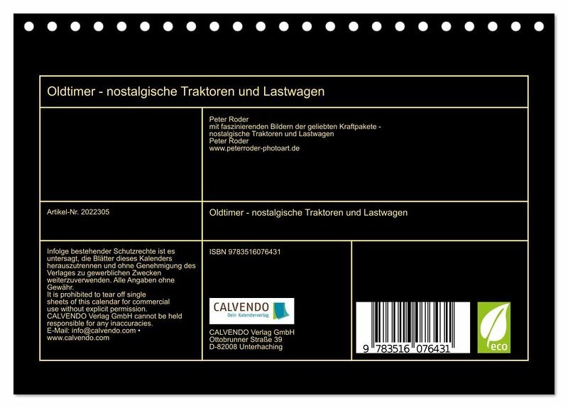 QUALITÄT - Hochwertiger Fotokalender mit 12 wunderschönen Motiven auf lichtbeständigem Bilderdruckpapier, robuste Spiralbindung.NACHHALTIG - deutliche Abfallreduzierung durch bedarfsgerechte Einzelstückfertigung, umweltfreundliches FSC-zertifiziertes Papier, Produktion in Deutschland, klimabewusste Logistik.PERFEKTES GESCHENK - Kalender für Freunde und Familie, für Kinder und Erwachsene, jung und alt, zu Weihnachten, Geburtstag oder zwischendurch.VIELFALT - Bildkalender in verschiedenen Formaten, z.B. DIN A5, DIN A4, DIN A3 sowie DIN A2. Ob Naturmotiv, Gemälde oder Fotos, ideal für ein persönliches Wohlfühlambiente.Nostalgische Traktoren und Lastwagen - geliebte Kraftpake, die viele in ihren Bann ziehen von Autor(in): Peter Roder