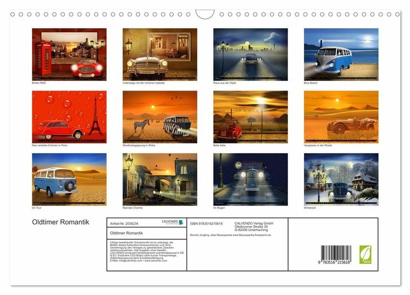 Oldtimer bringen uns die Erinnerungen: An das erste Auto, an wilde Flower-Power Zeiten, an die 50er, 60er und 70er Jahre und auch an die ersten Urlaubsreisen. Heute sind sie kostbare Schätze der Vergangenheit, die uns zum Träumen bringen. Die Bilder zu diesem Oldtimer-Kalender, wurden liebevoll und romantisch in Szene gesetzt und erfreuen damit sicherlich nicht nur Oldtimerfans.