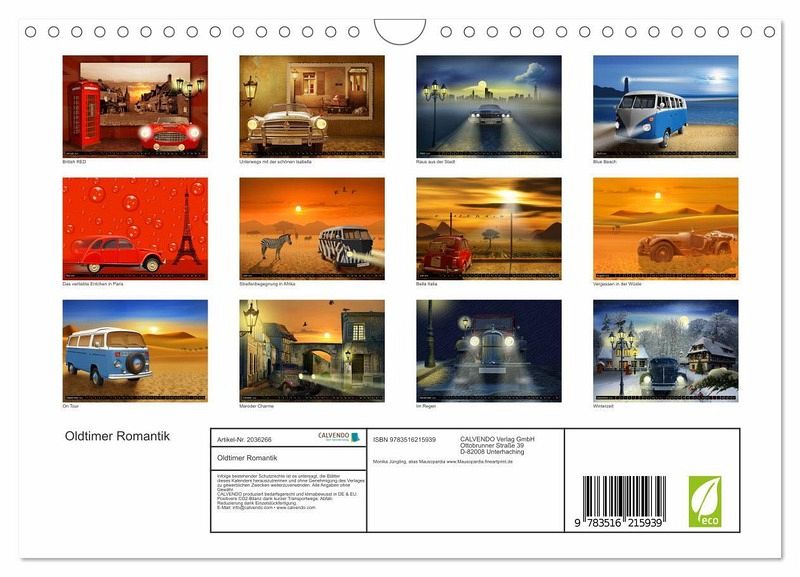 Oldtimer bringen uns die Erinnerungen: An das erste Auto, an wilde Flower-Power Zeiten, an die 50er, 60er und 70er Jahre und auch an die ersten Urlaubsreisen. Heute sind sie kostbare Schätze der Vergangenheit, die uns zum Träumen bringen. Die Bilder zu diesem Oldtimer-Kalender, wurden liebevoll und romantisch in Szene gesetzt und erfreuen damit sicherlich nicht nur Oldtimerfans.