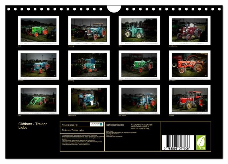 QUALITÄT - Hochwertiger Fotokalender mit 12 wunderschönen Motiven auf lichtbeständigem Bilderdruckpapier, robuste Spiralbindung mit Aufhängebügel.NACHHALTIG - deutliche Abfallreduzierung durch bedarfsgerechte Einzelstückfertigung, umweltfreundliches FSC-zertifiziertes Papier, Produktion in Deutschland, klimabewusste Logistik.PERFEKTES GESCHENK - Kalender für Freunde und Familie, für Kinder und Erwachsene, jung und alt, zu Weihnachten, Geburtstag oder zwischendurch.VIELFALT - Bildkalender in verschiedenen Formaten, z.B. DIN A5, DIN A4, DIN A3 sowie DIN A2. Ob Naturmotiv, Gemälde oder Fotos, ideal für ein persönliches Wohlfühlambiente.Nostalgische Traktoren - geliebte Kraftpake, die viele in ihren Bann ziehen von Autor(in): Peter Roder