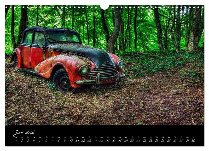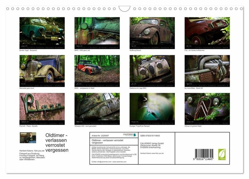 Dieser Kalender zeigt Fotografien von alten PKW zum Teil in Nahaufnahme. Abgestellte Fahrzeuge im Kontext mit der Natur. Der festgehaltene marode Verfall hat neben der schönen und hochwertigen fotografischen Seite, durchaus einen romantischen Charakter. Auch ein Kalender für nicht Oldtimerfans.