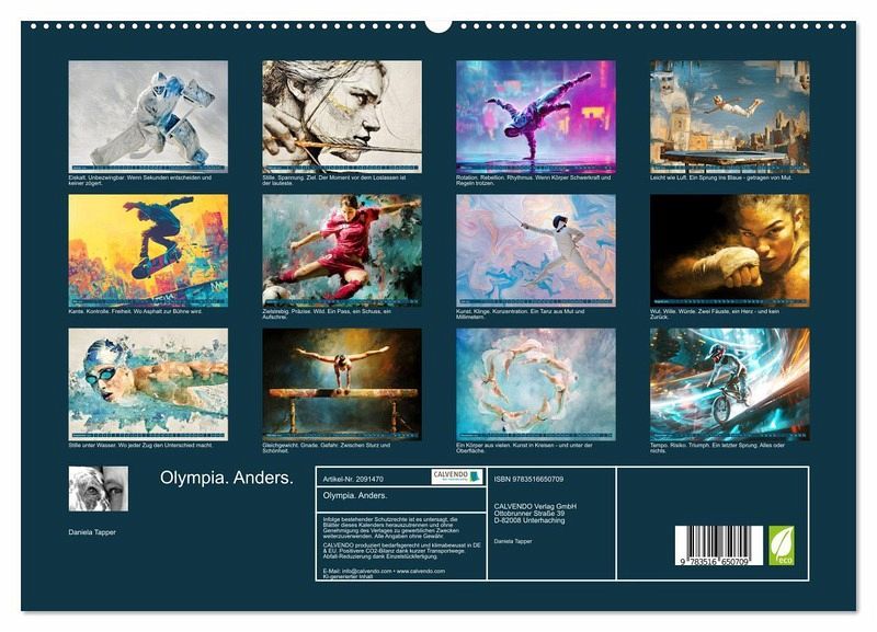 Die olympischen Spiele sind ein Tanz der Nationen - getragen von Sehnsucht, Mut und der Kunst des Augenblicks. Jeder Sprung, jede Drehung, jeder Wurf erzählt von Träumen, die größer sind als das Podium. Dieser Kalender macht die Sprache der Bewegung sichtbar - in poetischen Bildern, geschaffen mit KI. Zwölf stille Hymnen auf das, was Menschen verbindet. Für alle, die den Zauber der Spiele spüren, wenn die Welt für einen kurzen Moment den Atem anhält.
