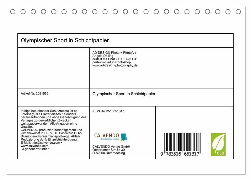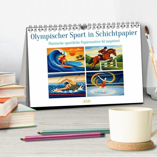 QUALITÄT - Hochwertiger Fotokalender mit 12 wunderschönen Motiven auf lichtbeständigem Bilderdruckpapier, robuste Spiralbindung.NACHHALTIG - deutliche Abfallreduzierung durch bedarfsgerechte Einzelstückfertigung, umweltfreundliches FSC-zertifiziertes Papier, Produktion in Deutschland, klimabewusste Logistik.PERFEKTES GESCHENK - Kalender für Freunde und Familie, für Kinder und Erwachsene, jung und alt, zu Weihnachten, Geburtstag oder zwischendurch.VIELFALT - Bildkalender in verschiedenen Formaten, z.B. DIN A5, DIN A4, DIN A3 sowie DIN A2. Ob Naturmotiv, Gemälde oder Fotos, ideal für ein persönliches Wohlfühlambiente.Ein kunstvoller Kalender mit 12 KI-generierten Illustrationen olympischer Sportarten, die in lebendiger Schichtpapier-Optik Bewegung und Emotion auf einzigartige Weise sichtbar machen. von Autor(in): Angela Dölling, AD DESIGN Photo + PhotoArt