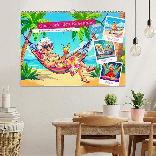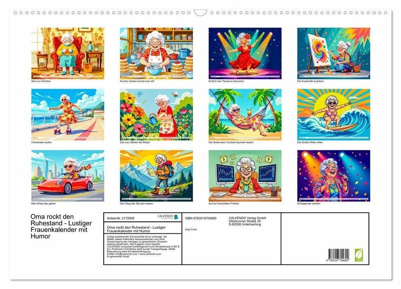 Dieser humorvolle Kalender "Oma rockt den Ruhestand - Lustiger Frauenkalender mit Humor" zeigt, wie schön das Leben in der Rente sein kann. Mit liebevoll gestalteten, bunten KI-generierten Illustrationen voller Witz und Charme begleitet er Frauen und Omas durch das Jahr. Ein ideales Geschenk zum Ruhestand, zur Rente oder für alle, die das Leben mit einem Augenzwinkern genießen möchten. Ob Hängematte, Prosecco oder kleine Abenteuer - dieser Kalender sorgt Monat für Monat für gute Laune und ist ein echter Blickfang an jeder Wand.