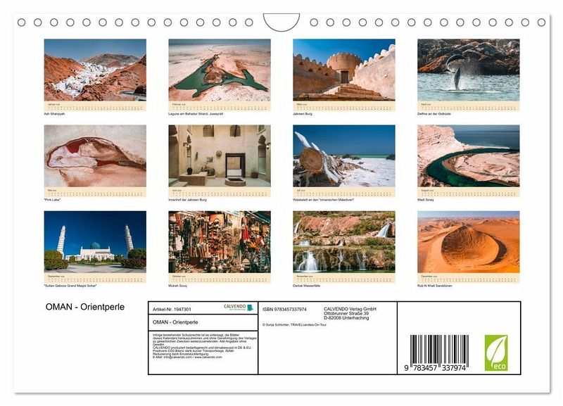 QUALITÄT - Hochwertiger Fotokalender mit 12 wunderschönen Motiven auf lichtbeständigem Bilderdruckpapier, robuste Spiralbindung mit Aufhängebügel.NACHHALTIG - deutliche Abfallreduzierung durch bedarfsgerechte Einzelstückfertigung, umweltfreundliches FSC-zertifiziertes Papier, Produktion in Deutschland, klimabewusste Logistik.PERFEKTES GESCHENK - Kalender für Freunde und Familie, für Kinder und Erwachsene, jung und alt, zu Weihnachten, Geburtstag oder zwischendurch.VIELFALT - Bildkalender in verschiedenen Formaten, z.B. DIN A5, DIN A4, DIN A3 sowie DIN A2. Ob Naturmotiv, Gemälde oder Fotos, ideal für ein persönliches Wohlfühlambiente.Eine Reise durch eines der schönsten Länder auf der arabischen Halbinsel von Autor(in): Sonja Schlichter