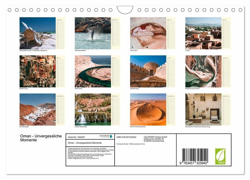 Der Oman, ein Land voller Kontraste und Traditionen, lädt Besucher dazu ein, seine Vielfalt zu entdecken. Von den majestätischen Bergen des Hajar-Gebirges bis zu den unberührten Stränden entlang der Küste bietet der Oman eine Fülle natürlicher Schönheit. Die atemberaubenden Landschaften, die reiche Kultur und die facettenreiche historische Vergangenheit machen jede Reise hier zu einem unvergesslichen Erlebnis. Mit ihrem Kalender, der zugleich als Planer dient, entführt die dauerreisende Sonja Schlichter Sie in eines der faszinierendsten Länder auf der arabischen Halbinsel. Lassen Sie sich von 13 beeindruckenden Bildern durch das Jahr begleiten und erleben Sie die reichhaltige Historie dieses orientalischen Juwels.