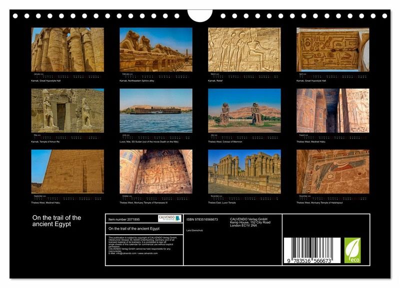 QUALITY - High-quality photo calendar with 12 beautiful images on light-resistant paper, robust spiral binding with hanger.SUSTAINABLE - Significant waste reduction due to print-on-demand production, environmentally friendly FSC-certified paper, produced in the UK, climate-conscious logistical processes.PERFECT GIFT - calendars for friends and family, for children, all ages and all occasions, from Christmas to birthdays and everything in between.LOTS OF CHOICE - Wall calendars in different sizes (DIN A4 and DIN A3), for any topic and personal taste, featuring photography, painting and illustrations.On the trail of the ancient Egypt in Thebes West and Thebes East, author: Lars Eberschulz