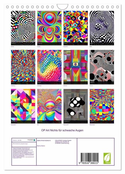 QUALITÄT - Hochwertiger Fotokalender mit 12 wunderschönen Motiven auf lichtbeständigem Bilderdruckpapier, robuste Spiralbindung mit Aufhängebügel.NACHHALTIG - deutliche Abfallreduzierung durch bedarfsgerechte Einzelstückfertigung, umweltfreundliches FSC-zertifiziertes Papier, Produktion in Deutschland, klimabewusste Logistik.PERFEKTES GESCHENK - Kalender für Freunde und Familie, für Kinder und Erwachsene, jung und alt, zu Weihnachten, Geburtstag oder zwischendurch.VIELFALT - Bildkalender in verschiedenen Formaten, z.B. DIN A5, DIN A4, DIN A3 sowie DIN A2. Ob Naturmotiv, Gemälde oder Fotos, ideal für ein persönliches Wohlfühlambiente.Op Art ist eine Kunst aus den 60igern, auch Optical Art genannt. von Autor(in): Martina Marten