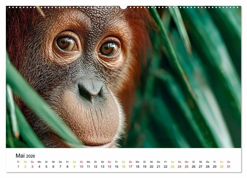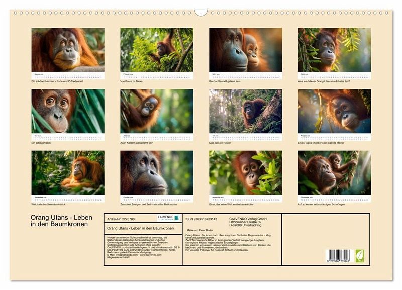 Orang-Utans: Sie leben hoch oben im grünen Dach des Regenwaldes - klug, voller Persönlichkeit und doch vom Aussterben bedroht. Majestätisch, intelligent und zutiefst berührend zeigen sie uns, wie Leben in den Baumkronen aussieht. Sie nehmen uns mit in ihre grüne Welt als die letzten großen Waldbewohner Asiens und erzählen von stillen Momenten, neugierigen Blicken und kletternden Kinderhänden. Gestaltet mit dem Auge fürs Detail berühren diese Bilder als Fenster in eine kostbare Tierwelt, wobei die grafische Umsetzung im Zusammenspiel klassischer Gestaltung und ausgewählter KI-basierter Methoden erfolgte. Dieser Kalender, ein visuelles Plädoyer für die größten Baumbewohner der Welt.