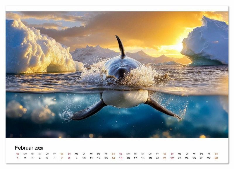 Erleben Sie die faszinierende Welt der Ozeane und begleiten Sie majestätische Schwertwale in ihrer ganzen Schönheit - von den eisigen Gewässern der Polargebiete bis zu den Tiefen der anderen Weltmeere, mit diesen zwölf beeindruckenden und faszinierenden KI-generierten Bildern. Ob kraftvolle Sprünge in Gruppen, ruhige Einzelporträts oder innige Momente zwischen Orca-Mutter und Kalb, jedes Bild erzählt eine eigene Geschichte. Das charakteristische schwarz-weiße Erscheinungsbild dieser beeindruckenden Meeressäuger verleiht jeder Szene eine erhabene, fast magische Wirkung. Ein Kalender für alle, die das Meer lieben, die Natur schätzen und die Eleganz der Orcas in ihrer natürlichen Umgebung erleben möchten.
