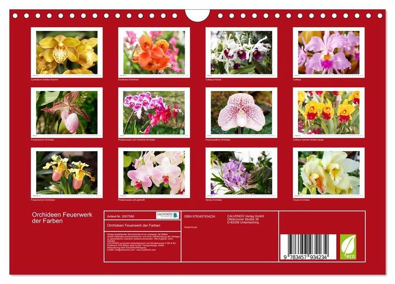 Von den Botanikern werden etwa 1000 Gattungen mit 15000 bis 30000 Arten anerkannt. Keine andere Pflanzenfamilie hat ein solches Spektrum, was Farben und Formen der Blüten betrifft. Dem Farben-Feuerwerk der Orchideen widmet sich dieser Kalender, der natürlich nur einen winzigen Ausschnitt der Pflanzenfamilie vorstellen kann. Erfreuen Sie sich an den gelungenen Porträtfotos Ihrer Lieblingsblume zu jeder Jahreszeit.