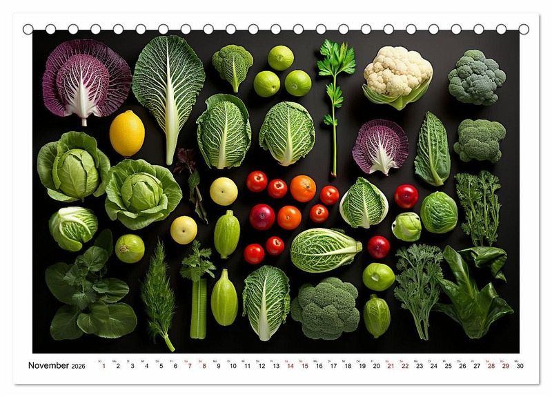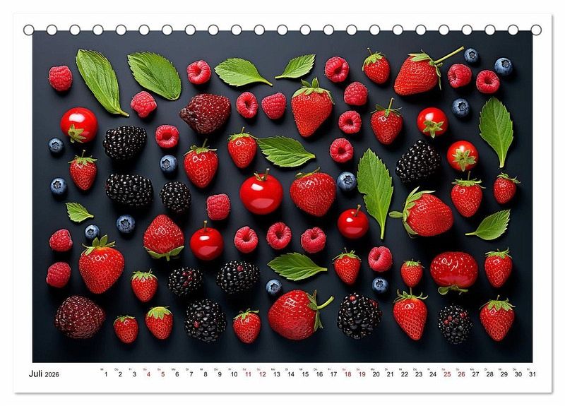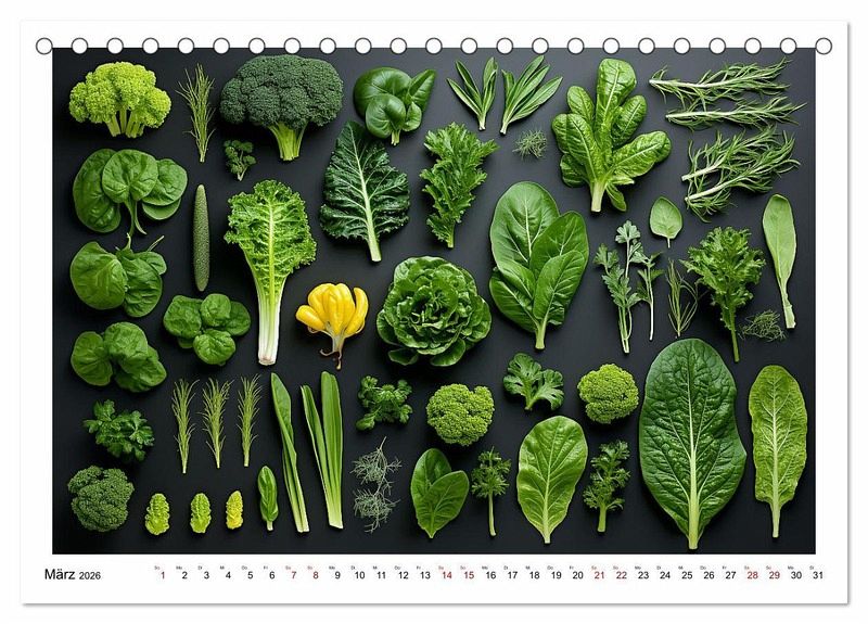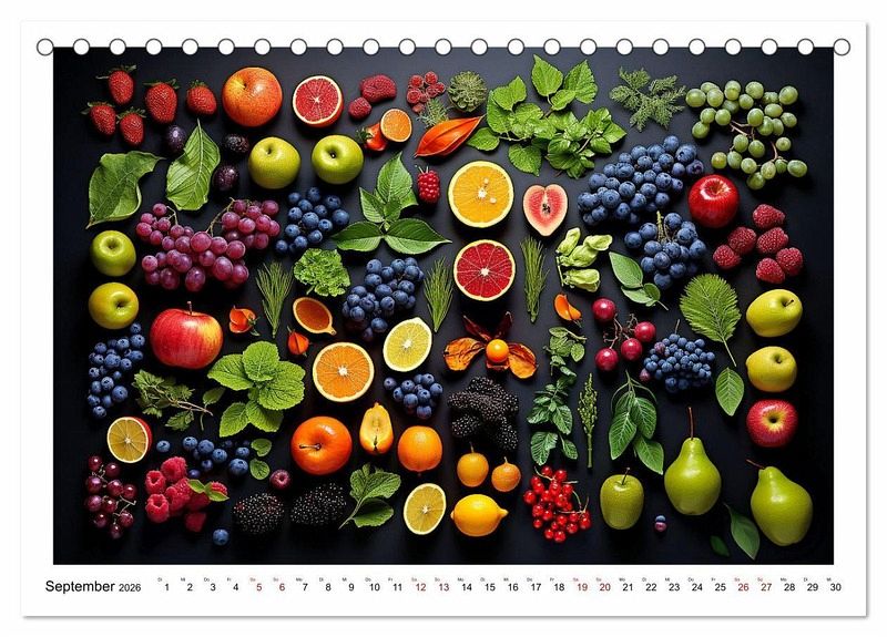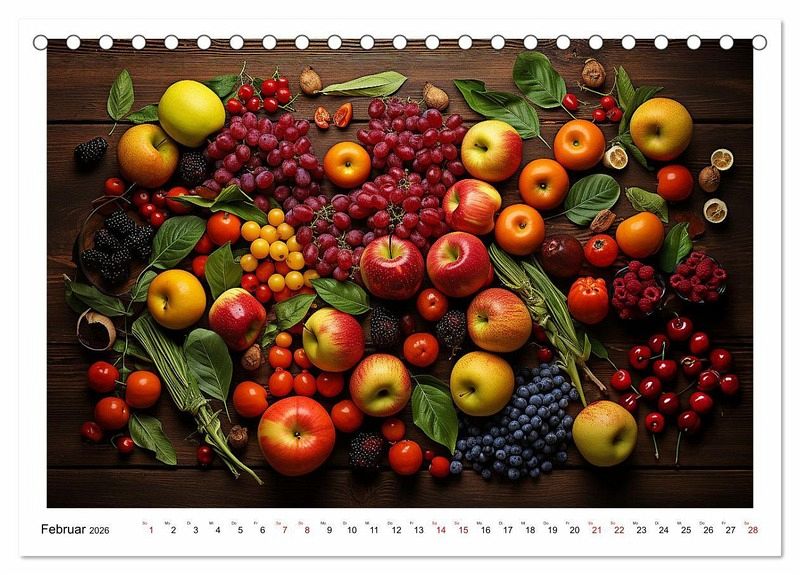 Jede Seite des Kalenders zeigt ein beeindruckendes Foto von köstlichen, farbenfrohen Lebensmitteln, die die Vielfalt und Schönheit einer ausgewogenen Ernährung repräsentieren. So isst das Auge schon mal mit und der Magen freut sich auf die nächste gesunde Mahlzeit.