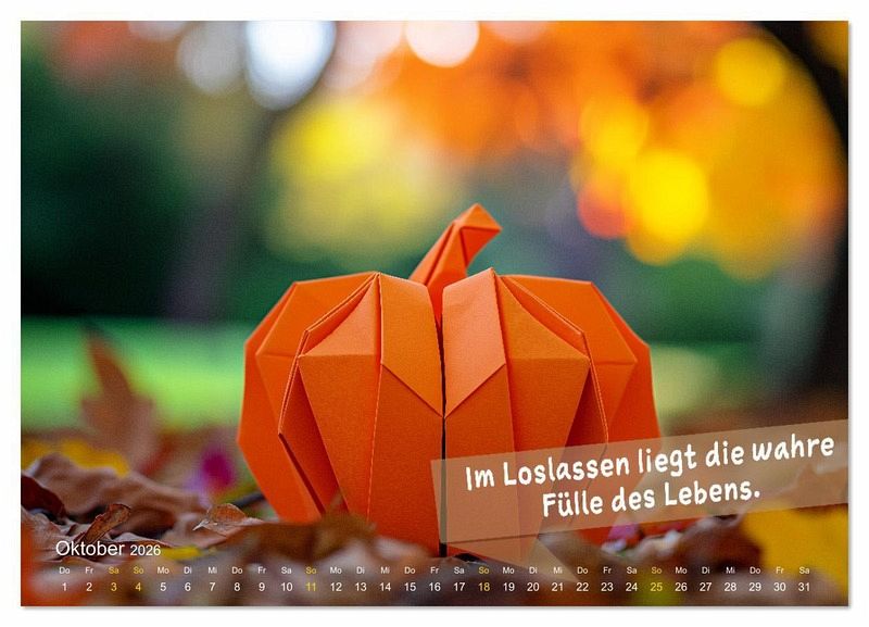 Oktober: Übung zu Origami-Kürbis im Herbstlaub: Stelle dir vor, wie die Blätter fallen und Platz für Neues schaffen. Lass alte Gedanken los. - Fördert Neuanfang und Klarheit.