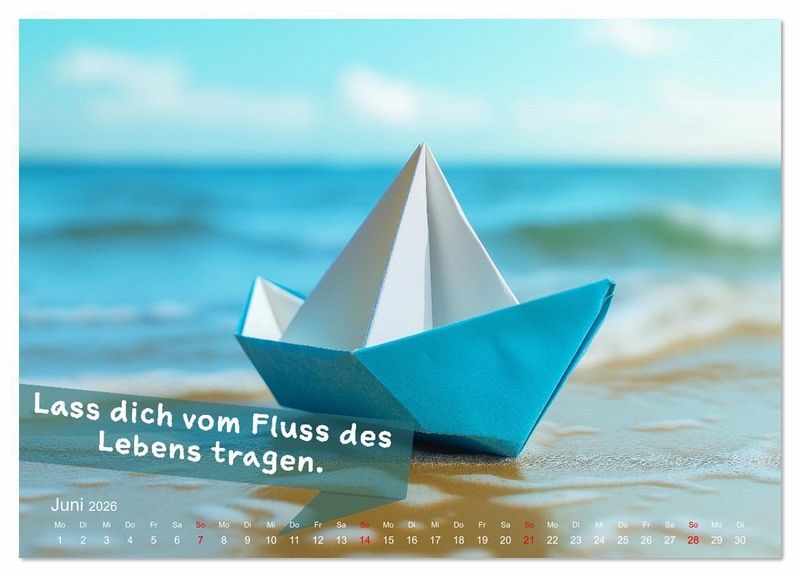 Juni: Übung zu Origami-Boot am Strand: Stelle dir vor, wie du sanft auf ruhigem Wasser treibst, während die Wellen dich tragen. - Fördert Gelassenheit.