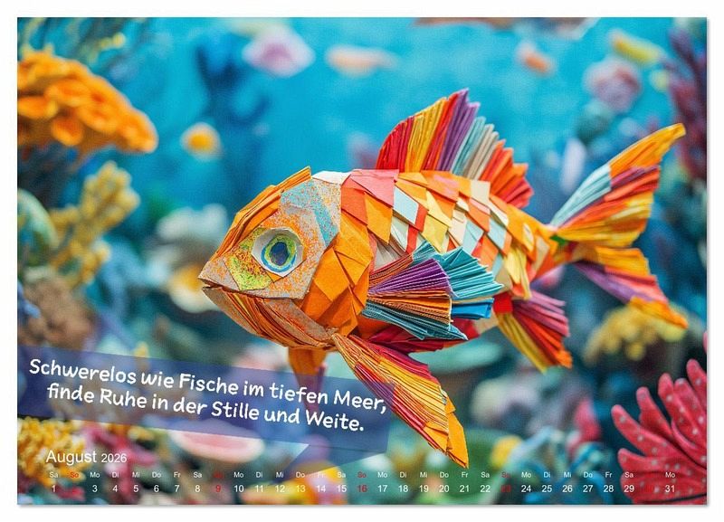 August: Übung zu Origami-Fisch im Ozean: Schließe die Augen und stelle dir vor, wie du schwerelos durch das Wasser gleitest. - Fördert Entspannung und Loslassen.
