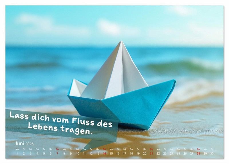 Juni: Übung zu Origami-Boot am Strand: Stelle dir vor, wie du sanft auf ruhigem Wasser treibst, während die Wellen dich tragen. - Fördert Gelassenheit.
