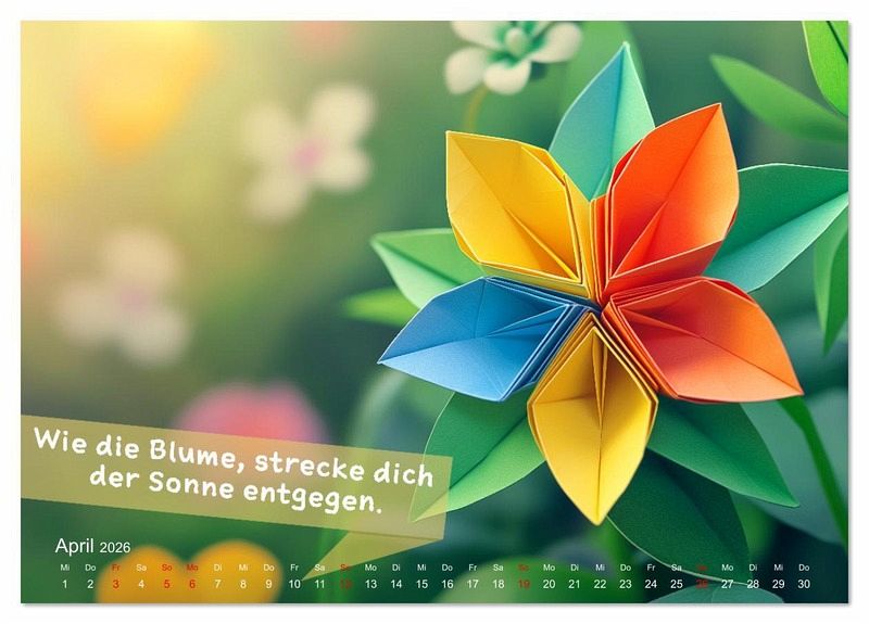 April: Übung zu Origami-Blume im Frühling: Strecke deine Arme über den Kopf, atme tief ein und fühle die frische Energie. - Erweckt neue Kraft.