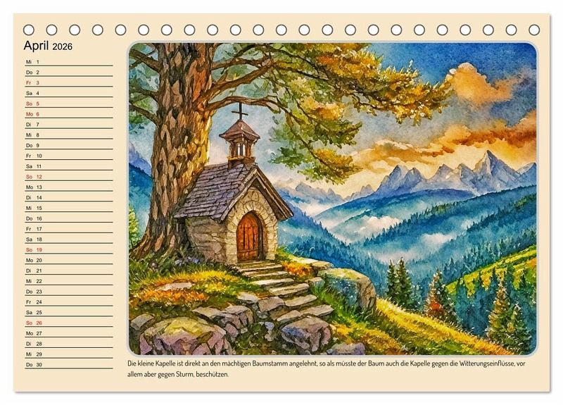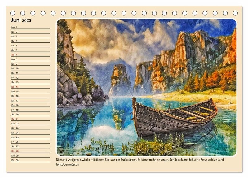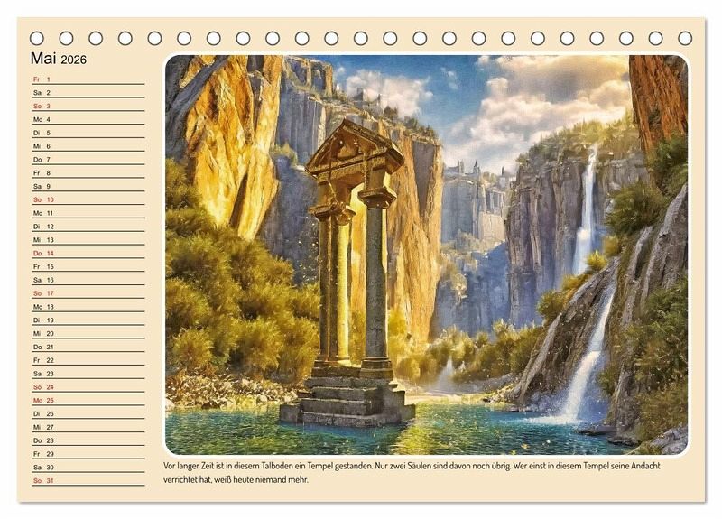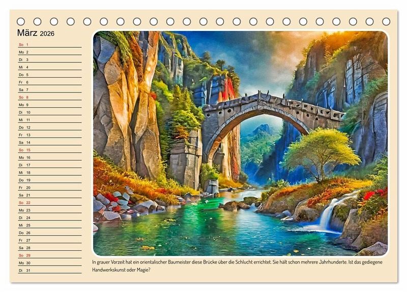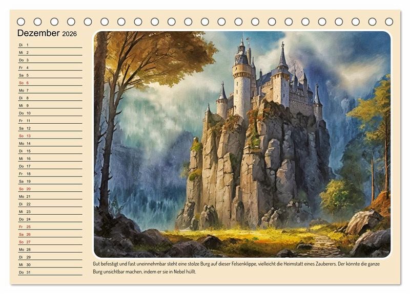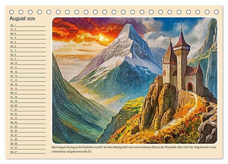 Dieser Kalender zeigt Orte, denen jeweils etwas Besonderes anhaftet. Kein Ort ist real, aber auch kein Ort ist so unwirklich, dass er nicht auch real sein könnte. Dennoch sind die Bilder geprägt vom Märchenhaften, vom Anflug des Mystischen. Mit Hilfe der künstlichen Intelligenz können wir anhand dieses Kalenders durch die Welt der Fantasie wandeln. Jedes Monatsbild lässt Raum für die eigene Vorstellung, für wahre und erfundene Geschichten und Träumereien.
