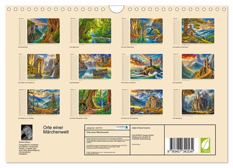 Dieser Kalender zeigt Orte, denen jeweils etwas Besonderes anhaftet. Kein Ort ist real, aber auch kein Ort ist so unwirklich, dass er nicht auch real sein könnte. Dennoch sind die Bilder geprägt vom Märchenhaften, vom Anflug des Mystischen. Mit Hilfe der künstlichen Intelligenz können wir anhand dieses Kalenders durch die Welt der Fantasie wandeln. Jedes Monatsbild lässt Raum für die eigene Vorstellung, für wahre und erfundene Geschichten und Träumereien.