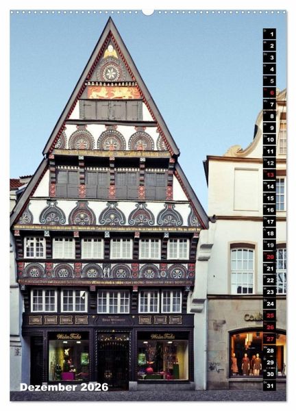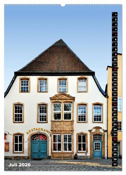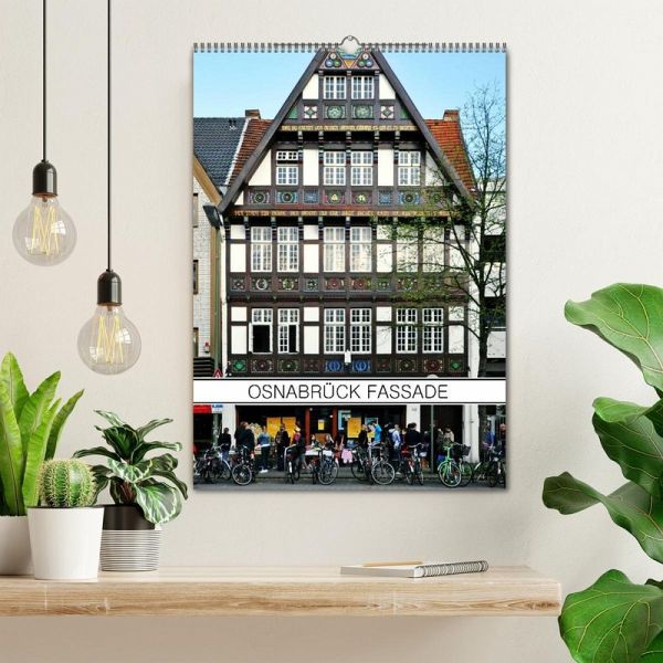 Osnabrück zeigt in diesem Architektur-Kalender 13 seiner auffälligsten Fassaden. Das reicht von reich verzierten Fachwerkhäusern bis zum Historismus. Dazu gesellt sich ein die Altstadt zitierender Ausrutscher aus der Nachkriegsmoderne vom Neumarkt. Die historische Altstadt ist dennoch überrepräsentiert, mit Gebäuden vom Markt, aus der Krahnstraße, der Bierstraße (das berühmte Hotel Walhalla), der Marienstraße oder dem Osnabrücker Dom. Neben dem Portal des Osnabrücker Hauptbahnhofs komplettiert der Ledenhof die Zusammenstellung.