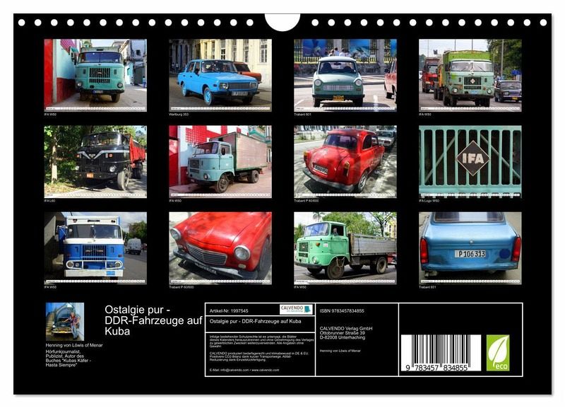 QUALITÄT - Hochwertiger Fotokalender mit 12 wunderschönen Motiven auf lichtbeständigem Bilderdruckpapier, robuste Spiralbindung mit Aufhängebügel.NACHHALTIG - deutliche Abfallreduzierung durch bedarfsgerechte Einzelstückfertigung, umweltfreundliches FSC-zertifiziertes Papier, Produktion in Deutschland, klimabewusste Logistik.PERFEKTES GESCHENK - Kalender für Freunde und Familie, für Kinder und Erwachsene, jung und alt, zu Weihnachten, Geburtstag oder zwischendurch.VIELFALT - Bildkalender in verschiedenen Formaten, z.B. DIN A5, DIN A4, DIN A3 sowie DIN A2. Ob Naturmotiv, Gemälde oder Fotos, ideal für ein persönliches Wohlfühlambiente.IFA W50, IFA L60, Trabant und Wartburg auf Kuba von Autor(in): Henning von Loewis of Menar