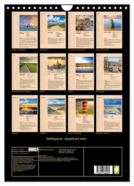 QUALITÄT - Hochwertiger Fotokalender mit 12 wunderschönen Motiven auf lichtbeständigem Bilderdruckpapier, robuste Spiralbindung mit Aufhängebügel.NACHHALTIG - deutliche Abfallreduzierung durch bedarfsgerechte Einzelstückfertigung, umweltfreundliches FSC-zertifiziertes Papier, Produktion in Deutschland, klimabewusste Logistik.PERFEKTES GESCHENK - Kalender für Freunde und Familie, für Kinder und Erwachsene, jung und alt, zu Weihnachten, Geburtstag oder zwischendurch.VIELFALT - Bildkalender in verschiedenen Formaten, z.B. DIN A5, DIN A4, DIN A3 sowie DIN A2. Ob Naturmotiv, Gemälde oder Fotos, ideal für ein persönliches Wohlfühlambiente.Ein kulinarischer Wandkalender mit original ostfriesischen Rezepten. von Autor(in): Peter Roder