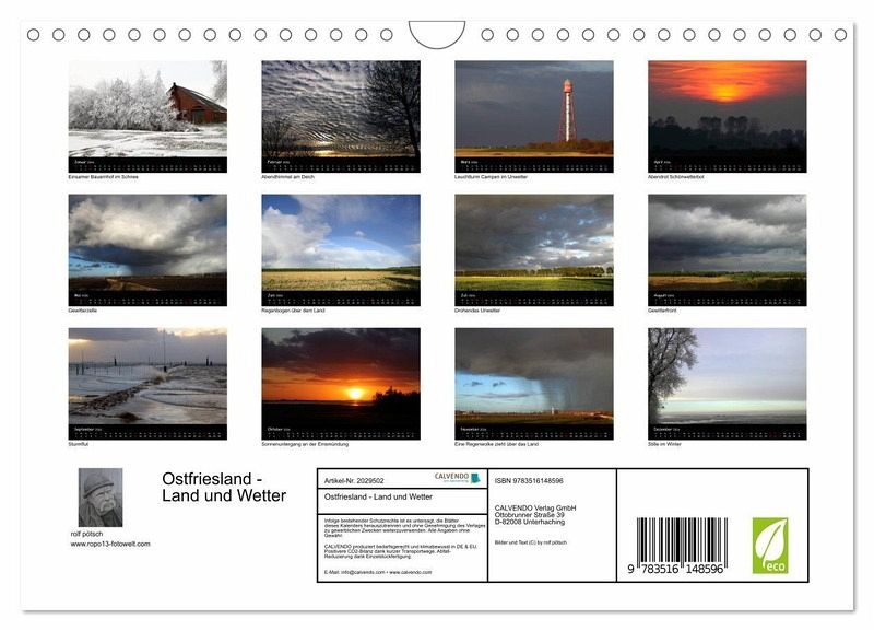 QUALITÄT - Hochwertiger Fotokalender mit 12 wunderschönen Motiven auf lichtbeständigem Bilderdruckpapier, robuste Spiralbindung mit Aufhängebügel.NACHHALTIG - deutliche Abfallreduzierung durch bedarfsgerechte Einzelstückfertigung, umweltfreundliches FSC-zertifiziertes Papier, Produktion in Deutschland, klimabewusste Logistik.PERFEKTES GESCHENK - Kalender für Freunde und Familie, für Kinder und Erwachsene, jung und alt, zu Weihnachten, Geburtstag oder zwischendurch.VIELFALT - Bildkalender in verschiedenen Formaten, z.B. DIN A5, DIN A4, DIN A3 sowie DIN A2. Ob Naturmotiv, Gemälde oder Fotos, ideal für ein persönliches Wohlfühlambiente.Ostfriesland eine Landschaft die von Wind und Wetter geprägt wird. Beeindruckende Fotos des Fotografen rolf pötsch. von Autor(in): ropo13